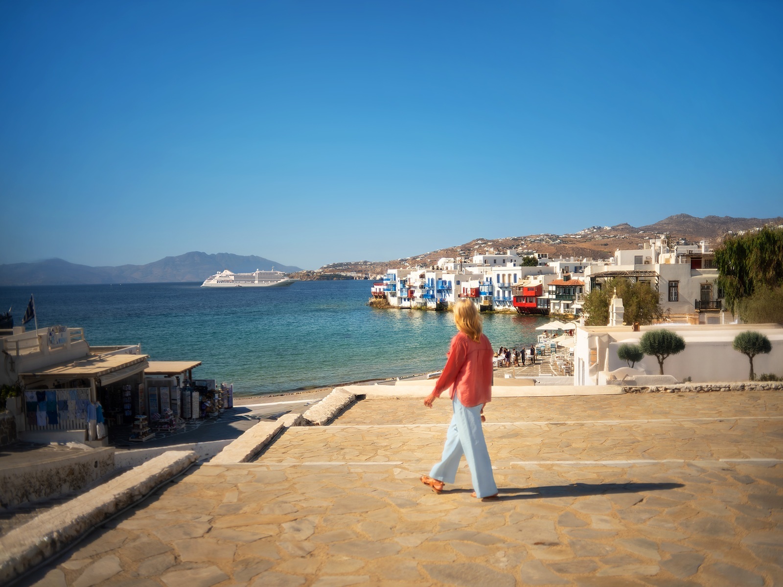 Back in Mykonos Town, aka Hora, head straight for Little Venice, the old fishing quarter, the waterfront now lined with bars and tavernas. The cocktails may be overpriced, but the views of the old houses with brightly-colored balconies overhanging the sea are divine. The water is so clear you can spot sea urchins scattered across the sea bed. Keep an eye out for the island's resident pelicans, which strut imperiously into the fish tavernas for snacks from the kitchen.